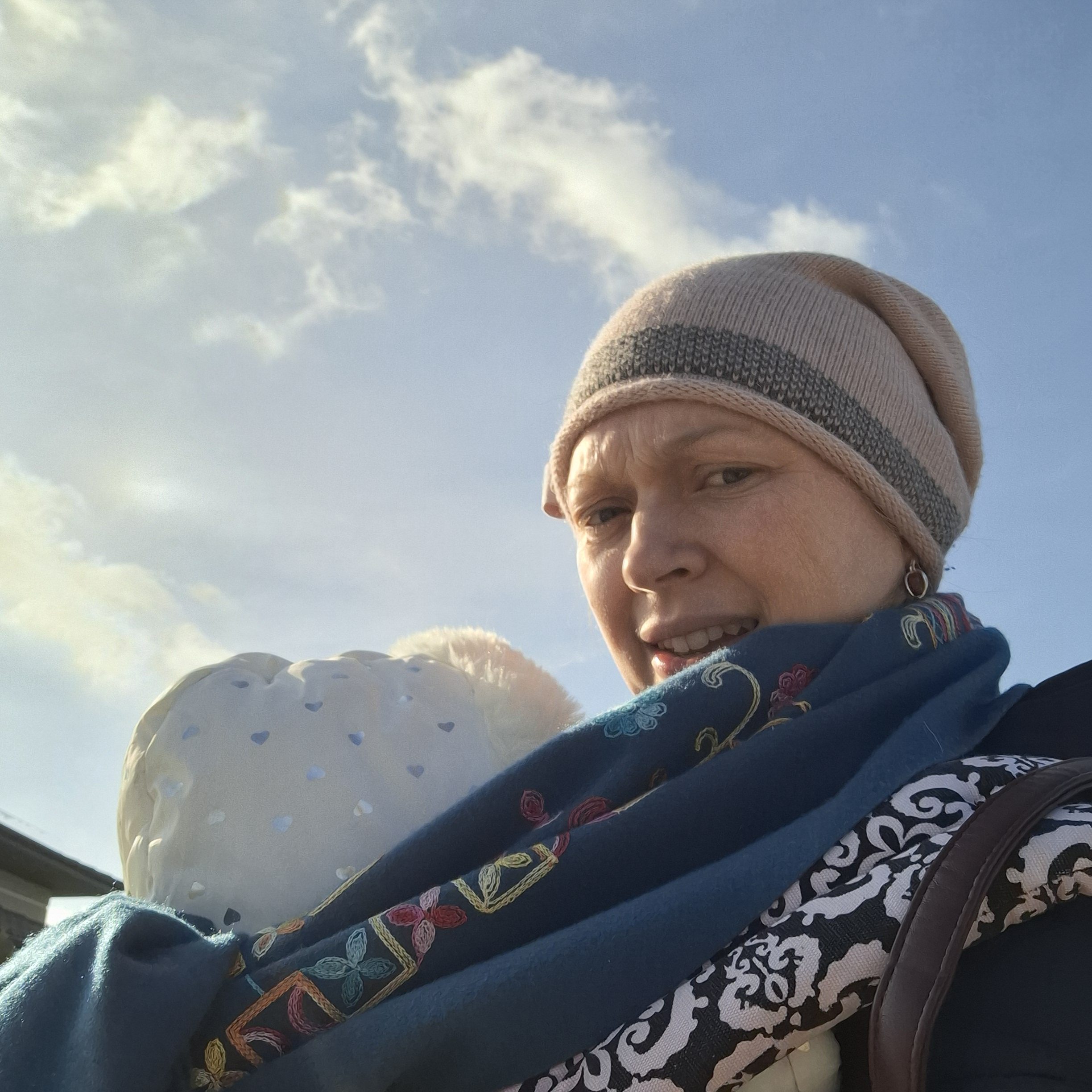 Pogoda wreszcie wiosenna, więc wyciągnęłam naszego Dwulatka na spacerek, a że Malutka dopiero co się obudziła po drzemce, nie chciała leżeć w wózku, więc nosidełka się przydały. A skoro one, to i plecaczek, żeby było gdzie schować telefon i klucze do domu, bo nosidełko zablokowało dostęp do kieszeni w kurtce. Dobra, mniejsza z tym. Było trochę wiatru, więc przydał się też szeroki ciepły szal, żeby dodatkowo opatulić siebie i Małą za jednym, dosłownie, zamachem 😉