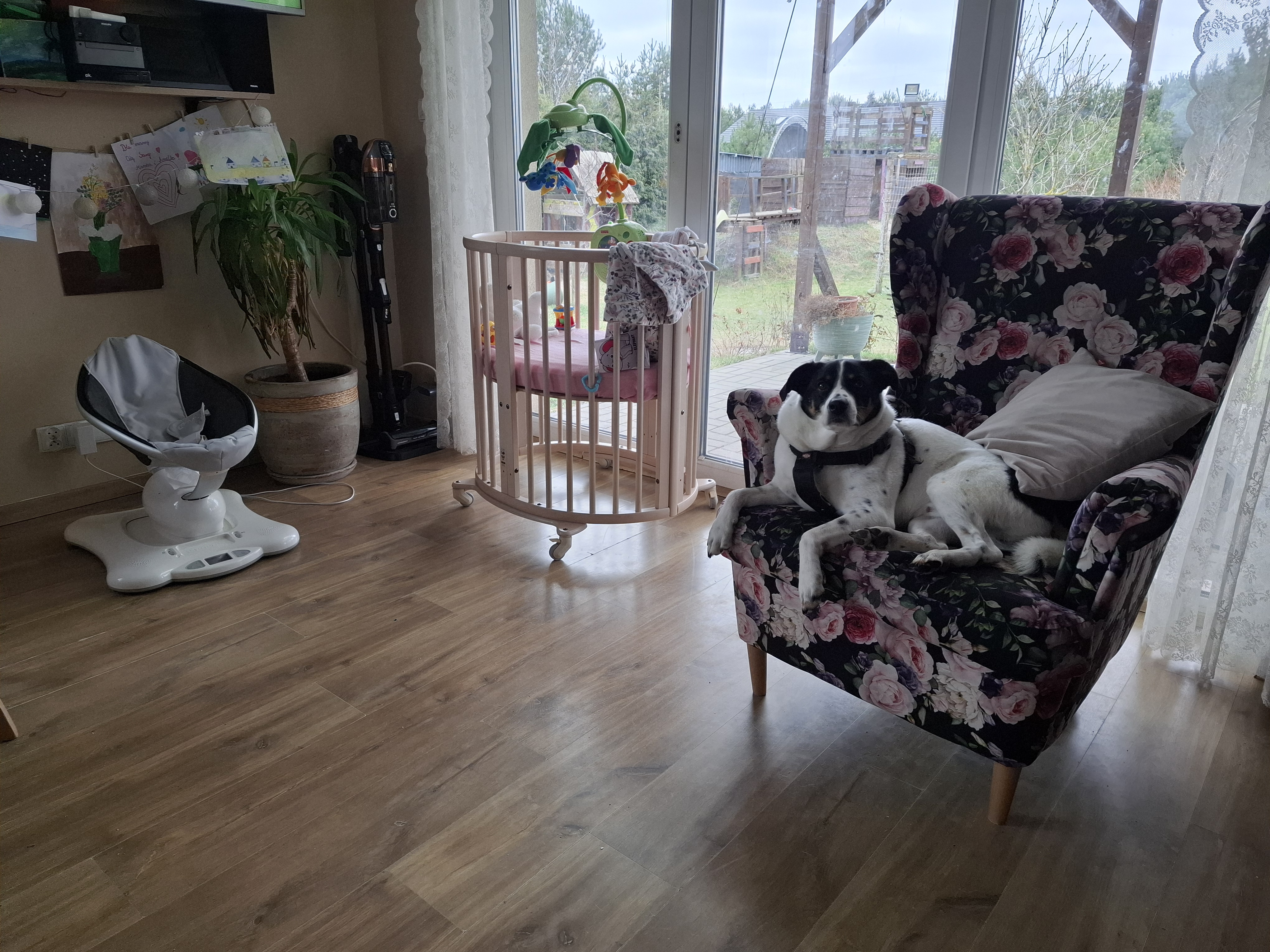 - fotel do karmienia z wygodną poduszką lub – przy noworodku – rogalem do karmienia, a może – jak na zdjęciu – z… psem 😉 żarcik. Ale tak, nasz Amor spiera się ze mną o ten fotel. 😉