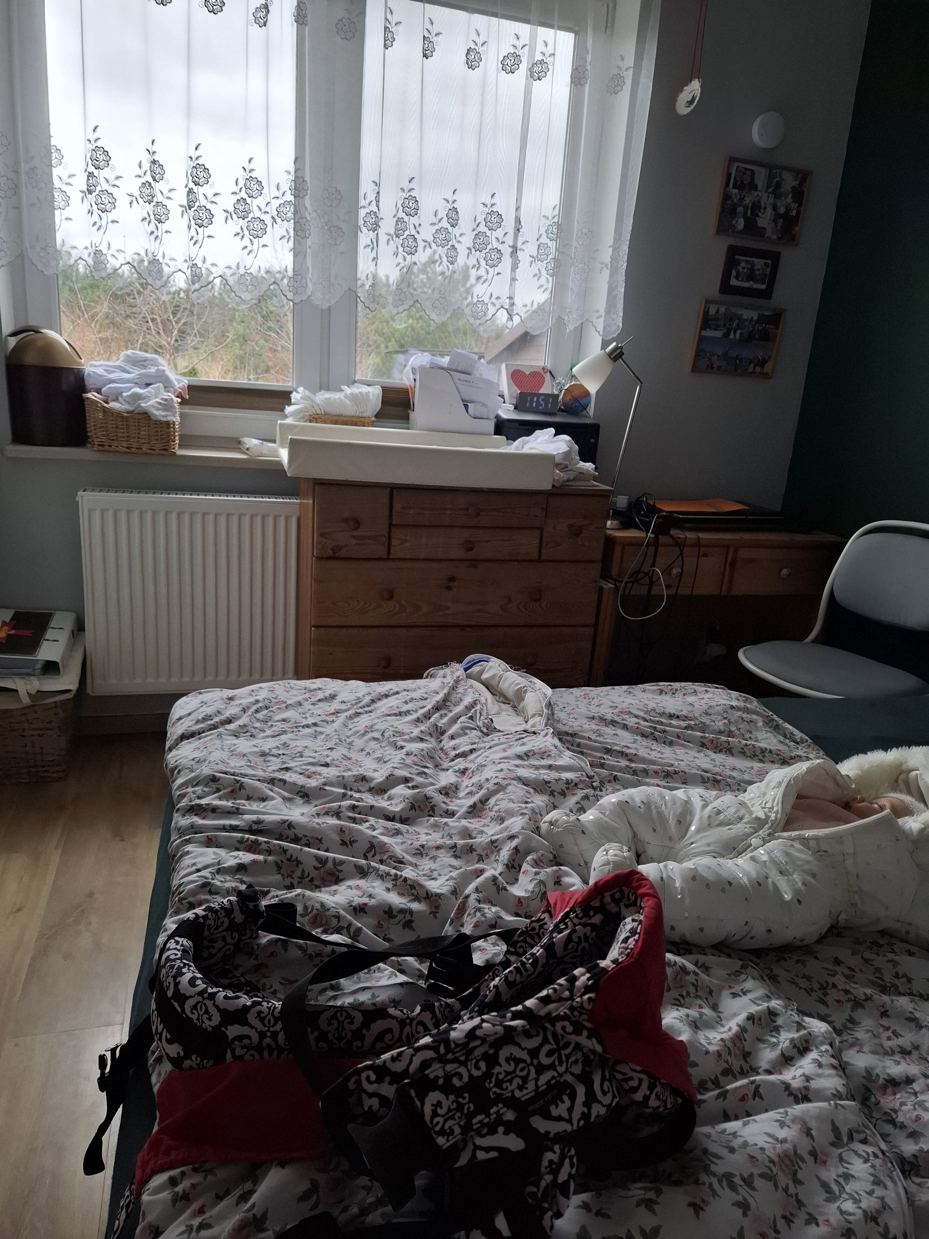 Zwróćcie uwagę na jeden jeszcze szczegół na zdjęciu (to zadanie dla bardzo wnikliwych “analizatorów” zdjęć ;)) – zegar elektroniczny, który ZAWSZE świeci :))) Spełnienie mojego mikro marzenia wreszcie – przy Szóstym – nastąpiło. Teraz zawsze jak budzę się na karmienie, to widzę od razu która godzina. Przy okazji taki zegar daje mi lekką poświatę, więc w ciemności nocy oświetla mi delikatnie Dziecinę, aby łatwiej było trafić do piersi ;)) Zegar ten jest na stałe podpięty do prądu, więc jeśli o takim myślicie (polecam! Na allegro znajdziecie ;)), to pomyślcie również o dostępie do gniazdka.