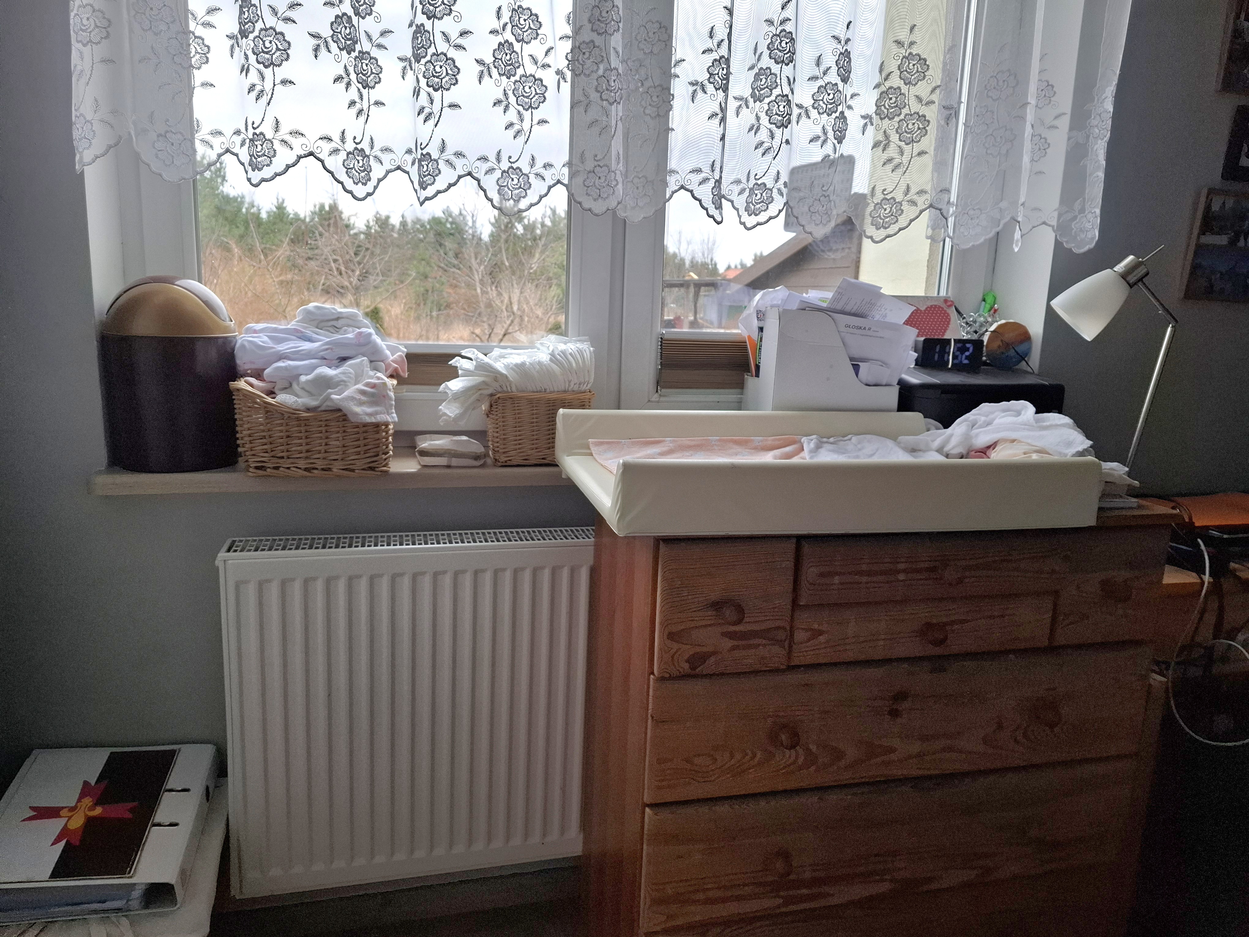Okey. Wracamy do tematu głównego i dalszego omawiania kącika do przewijania. Przewijak przymontował Tatuś kątownikami od strony pleców szafki, więc jest stabilnie. Wysokość szafki jest idealnie taka, aby było wygodnie przewijać, przebierać i pielęgnować dziecinę. A zaraz obok, na parapecie jest wszystko, co jeszcze potrzebne: jeden koszyk wiklinowy z pampersami (u nas od dawna na topie Dady z Biedry lub Lupilu z Lidla – w zależności gdzie akurat bylo po drodze na zakupy; nie przywiązujemy sie zbytnio do marki pampersów, ale te wymienione powyżej sprawdzają się nam super), drugi – większy – koszyk na brudne ubranka (no bo prane osobno w dziecięcym proszku [u nas – Lovela], więc nie wrzucam ich do wspólnego kosza na pranie; przy okazji – jak długo pierzecie w ten sposób? Ja przy każdym kolejnym piorę wspólnie w normalnym proszku coraz szybciej, ciekawe jak będzie tym razem… w każdym razie przed roczkiem już mamy wspólne prania i normalny proszek) oraz kosz na śmieci – głównie na zużyte pampersy. Obok, też na parapecie, oczywiście miejsce na mokre chusteczki (polecam te zupełnie bezzapachowe, “aqua” – super nowość, przy wcześniejszych dzieciach nie widziałam takich w sklepie; nareszcie nie muszę dodatkowo truć ich skóry tymi sztucznymi zapachami). Na przewijaku zawsze leży pieluszka tetrowa lub materiałowa, żeby w razie nagłej fontanny przy przebieraniu było czym łapać niespodziankę. A przy okazji dziecku jest cieplej niż na zimnej gumie. Z kolei prześcieradła z gumką na przewijak mi się nie sprawdziły, bo musiałabym ich mieć tyle co tych zwykłych materiałowych właśnie – to się może często brudzić…