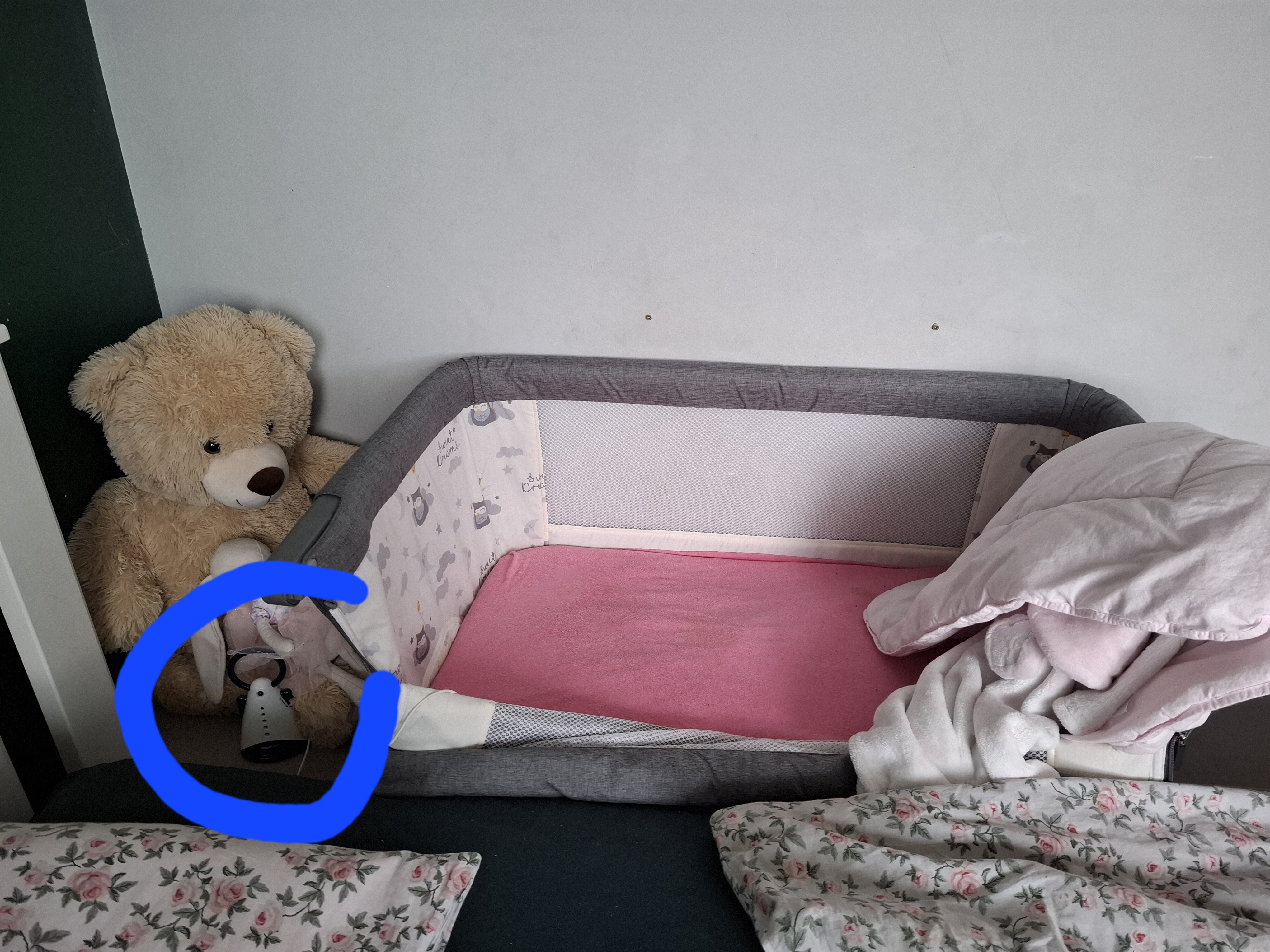 Trzeba ją oczywiście ustawić tak, aby materacyk dziecka był na równi z naszym, a po drodze nie było żadnych przeszkód w postaci ścian dostawki (w późniejszym etapie pewnie będą potrzebne, ale teraz, gdy Mała jeszcze się w żaden sposób nie przemieszcza, jest bezpiecznie). Chodzi o to, aby karmienia nocne były jak najłagodniejsze i nie zakłócały snu mamy. Ja karmię w nocy tylko na leżąco, a że akurat karmię tylko lewą piersią (taka fizjologia, albo inaczej – taka moja “uroda”, że prawa pierś nie współpracuje; ale nie martwcie się – wykarmiłam w ten sposób w 100% naturalnie już 5 dzieci, a szóste in progress, więc się da!), to mam mega ułatwienie – “przeturlowywuję” Małą do mnie, a po karmieniu “odturlowywuję” ją spowrotem. Przy okazji ma nocne ćwiczenia przekręcania się z brzuszka na plecki itp ;)) A tak, właśnie – nasze dzieci, od Trzeciego począwszy, śpią w nocy tylko na brzuszku. Plecka? No way! Nie ma innej opcji niż brzuszek. A zaczęło się wszystko właśnie gdy Trzeci miał tydzień i zachłysnął się tak, że wzywaliśmy karetkę. Leżał wtedy na plecach lub boku (nie ma to większego znaczenia, bo gdy dziecko leży na boku, tez może przekręcić głowę “do góry”, czyli wychodzi na to samo – usta i nos są w górze. A czy widział ktoś kiedyś aby wymiotować mając głowę na wznak? No nie. Gdy wymiotujemy, zawsze mamy głowę skierowaną w dół, dlatego uważam, że to jedyna bezpieczna pozycja. A że od razu odzywa się chór zwolenników teorii, że na brzuszku dziecko może przestać oddychać, kupiliśmy monitor oddechu. O tutaj, pokażę Wam, gdzie się go włącza i wyłącza (wyłącza się oczywiście np. na czas karmienia, bo wtedy zacznie alarmować, że nie wyczuwa Malucha; uwierzcie mi, można się przyzwyczaić do tego wyłączania bardzo szybko, ja już robię to odruchowo – kiedy dziecko zaczyna się budzić, wyłączam monitor i dopiero wtedy biorę dziecko).: