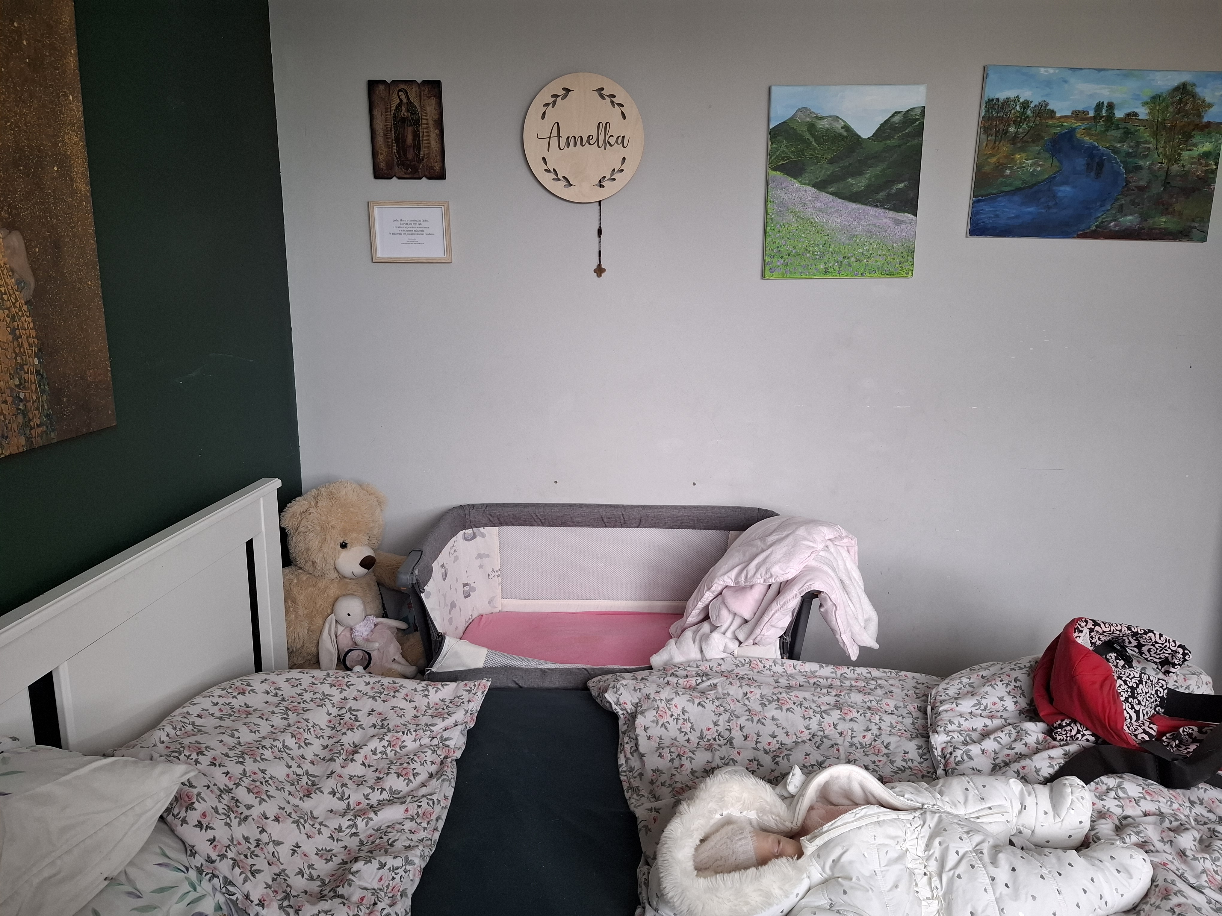 Hej! Witajcie! To mój pierwszy wpis po szóstym porodzie. Tak mnie jakoś natchnęło, żeby opowiedzieć Wam i pokazać jakie nowości mamy przy szóstym dziecku 🙂 Któżby się spodziewał, że przy szóstym jeszcze coś może nowego być, a jednak! Po Piątym nie wiedzieliśmy, czy się jeszcze zdecydujemy na kolejny Skarb, a poza tym dom robił się ciasny, więc od razu wydawaliśmy wszystko, co już dla Piątego nie było potrzebne. Z tego też powodu, gdy byłam w ciąży z Szóstą, a znajomi zapytali czy coś potrzebujemy, bo z kolei oni mieli parę rzeczy na wydaniu, z chęcią przejrzałam co też to takiego. W ten sposób po raz pierwszy w naszym salonie zawitało “łóżeczko-jajo”, czyli taka mała, owalna wersja łóżeczka niemowlęcego – żeby Malutka w ciągu dnia mogła być z nami w salonie, czyli tam gdzie spędzamy najwięcej czasu. Z kolei sypialnię zaopatrzyłam w dostawkę z olx, która zajmuje mało miejsca. Jest to istotne, bo musieliśmy też w naszej malej sypialni pomieścić biuro – wcześniejsze biuro przerobiliśmy na pokoik Piątego (wspominałam już, że zrobiło się ciaśniej 😉 ). Dobra, dosyć gadania, czas też trochę pokazać i wtedy opowiem dalej. A więc…: